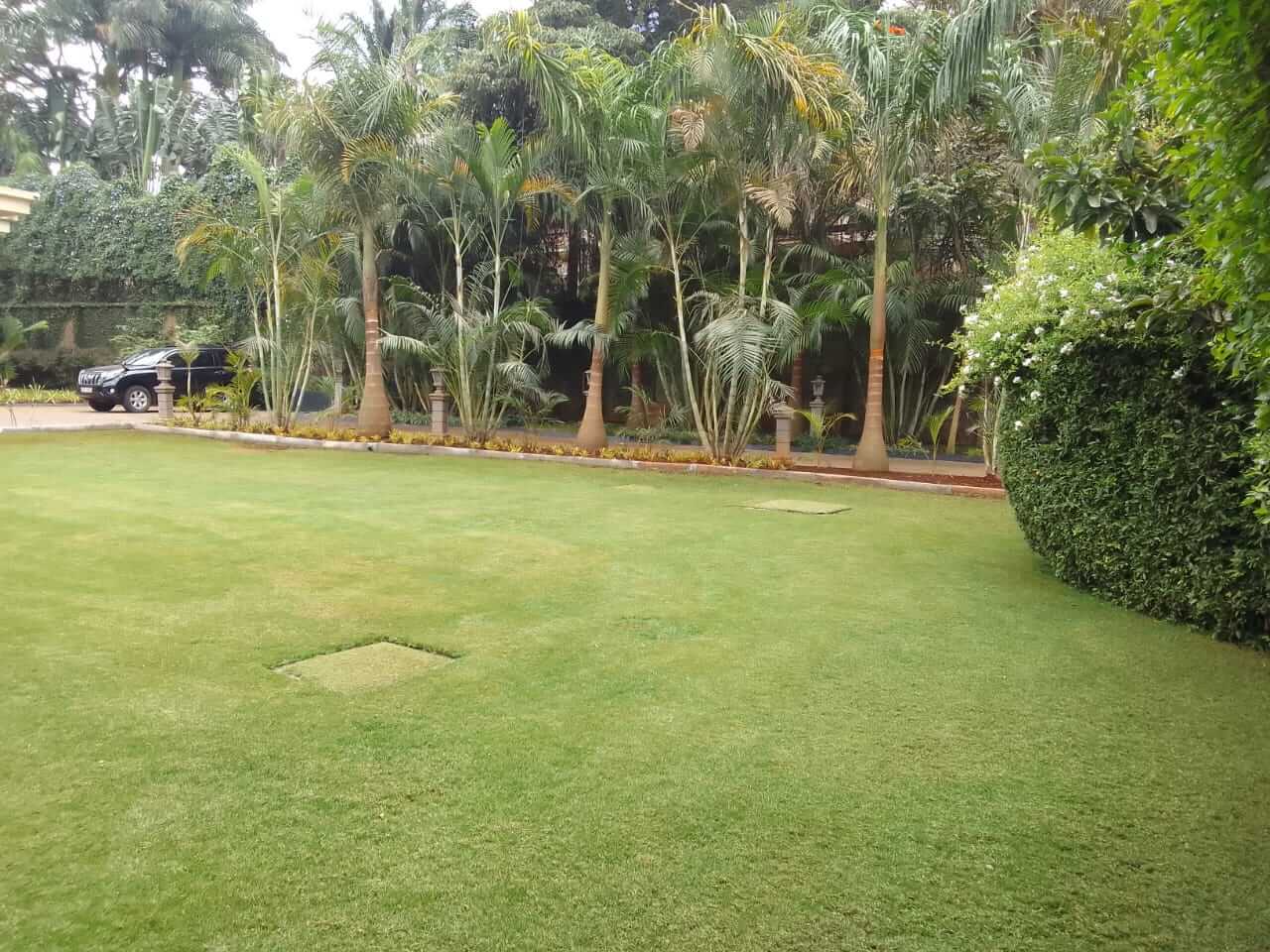 This Karen estate residence needed a complete lawn transformation. The existing grass was patchy, weed-infested, and struggling due to poor soil quality and inadequate drainage. Our team conducted soil analysis, improved drainage, prepared the ground with premium soil amendments, and installed high-quality Kikuyu grass using the sprigs.